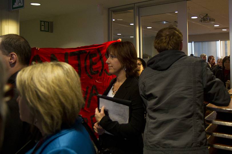 Voyant que l’issue du débat allait à l’encontre de leurs revendications, les étudiants présents se sont fâchés, scandant des slogans qui ont mené à l’interruption de la séance. La future représentante des étudiants de 1er cycle au BdG, Nicole Desnoyers, a mené le bal en hurlant que le Bureau ne considérait pas le point de vue des étudiants contre la hausse. « Annulons cette rencontre, s’est-elle époumonée. Si vous avez quelque chose à dire, levez-vous et partagez-le. »