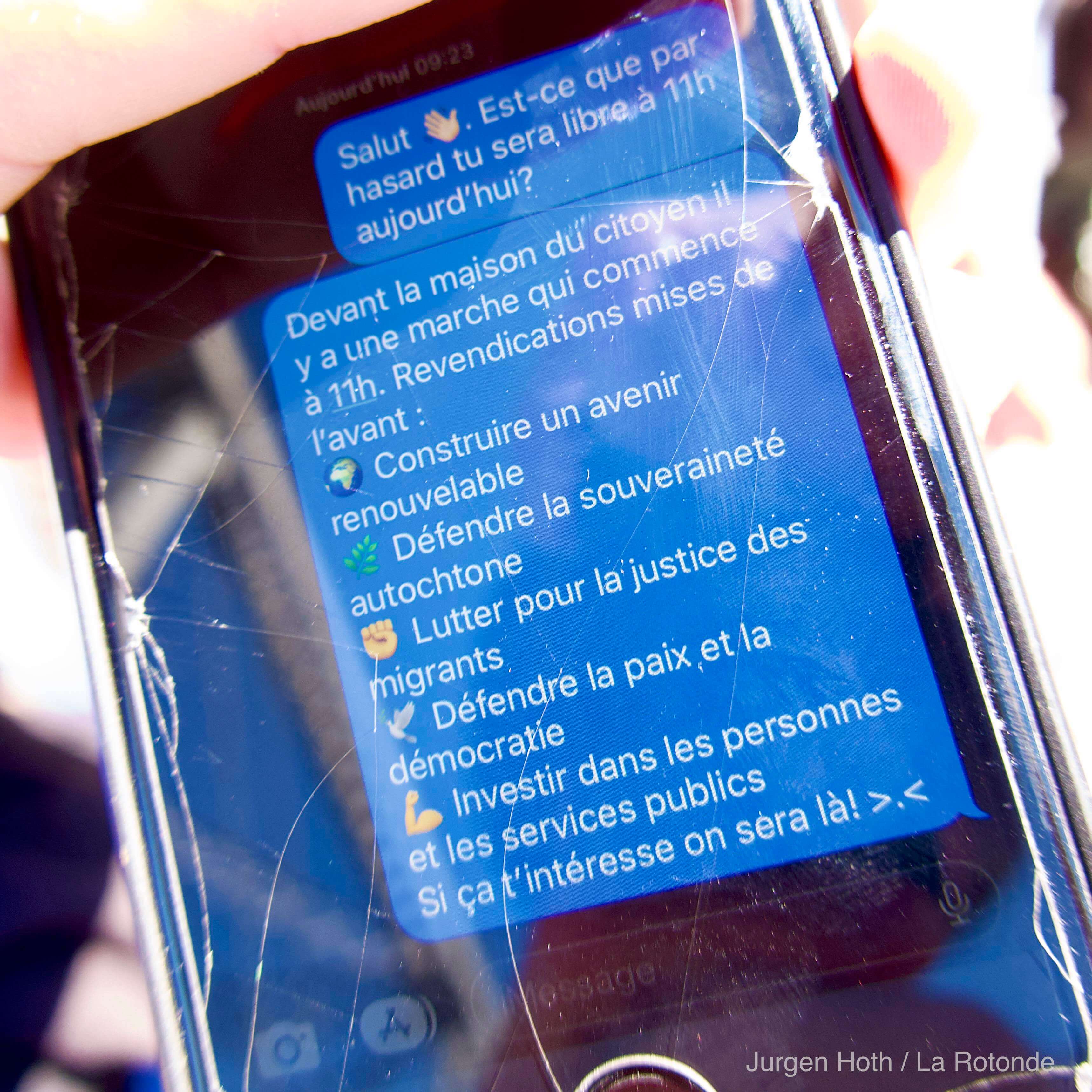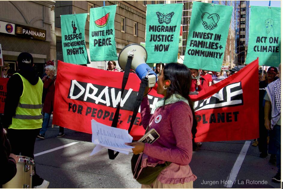Au cœur du rassemblement, 5 revendications principales : la justice économique, avec le refus des coupes de 15 % dans les services publics et un appel à réinvestir dans le logement, la santé, l’éducation et l’alimentation ; le respect de la souveraineté autochtone par l’opposition au projet de loi C-5 ; la justice pour les migrant.e.s avec le rejet du projet de loi C-2 ; la justice climatique en denoncant le projet minier La Loutre ; puis la paix et la démocratie notamment par le refus de l’augmentation du budget militaire et des ventes d’armes, en particulier à Israël, accusé de mener un génocide à Gaza.
